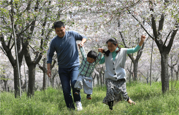 A family enjoys the cherry blossoms in Hefei, Anhui province on March 25, 2021. The China Tourism Academy expects that 4.1 billion domestic trips will be made this year. [Photo/Asia News Photo]