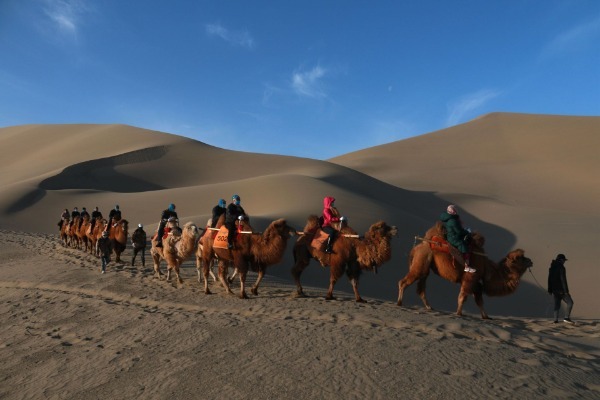 Visitors tour around the Mingshashan scenic spot, Dunhuang city, Gansu province, April 3, 2021.[Photo/Xinhua]