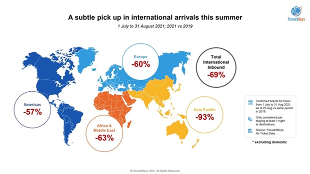 The northern hemisphere summer months of July – August reflected a subtle improvement in the number of international arrivals around the world. When comparing 2021 results with 2019, the Americas were down by 57% and Europe down by 60% – in a much better position than the Asia-Pacific region, down by 93%.