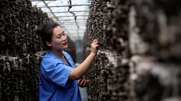 An employee is harvesting wood ear in the county-level city of Dongning in Mudanjiang, Heilongjiang Province. (Photo/Provided to People’s Daily Online)