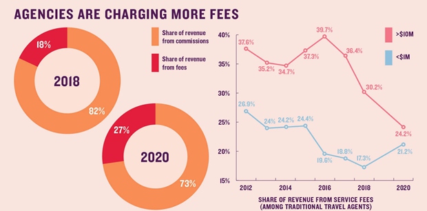 Although service fees, generally speaking, had been trending downward prior to the pandemic, dropping from 22% of revenue in 2016 to 18% in 2018, they appear to be back on the upswing. For 2020, service fees accounted for 13% of total revenue across all agency types, but a category of "other fees" — newly added to this year's study — made up 14% of total revenue, consequently growing the total fees category to a sizable 27% of revenue. Those can include fees for cancellation and rebooking, retainers, membership and concierge services, among others.