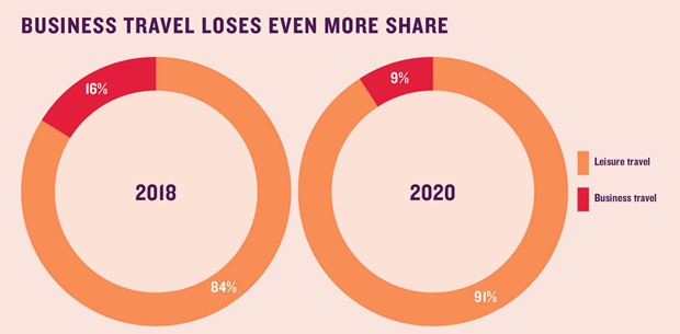 Leisure travel has always dominated in this survey, but it took an even larger piece of the pie in 2020 than in 2018, jumping from 84% to 91% of sales. The high concentration on leisure travel products was primarily generated by home-based agencies, while traditional agencies making more than $3 million continued to focus the most on business travel, representing about a third of their revenue.