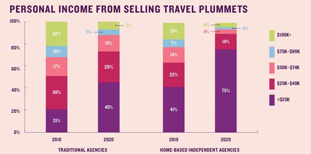 Overall personal income from selling travel has plummeted. In 2019, 31% of all travel sellers made less than $25,000 per year selling travel; this year it's 60%. Most of those are home-based advisors, but a full 45% of traditional agency advisors also made less than $25,000, surging from only 21% in 2019. And overall, advisors making more than $100,000 plummeted, from 19% in 2019 to 4% in 2020.