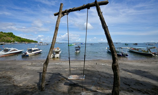 This picture taken on November 22, 2021 shows a swing near boats anchored along the shore in Pemenang on North Lombok island, where tourists used to take the ferry to Gili Trawangan. Photo: AFP