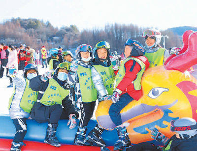 Primary school students who attend the 8th National Public Ice and Snow Season in Shennongjia Forestry District, central China’s Hubei Province, pose for a group photo. (Photo courtesy of the Publicity Department of the CPC Shennongjia Forestry District Committee)
