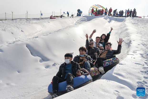 Tourists play on snow tubes at Oynak ski resort in Moyu County, northwest China's Xinjiang Uygur Autonomous Region, Jan. 9, 2022. Located on the southern brim of the Taklimakan Desert, Moyu County barely snows in winter. In order to boost its winter tourism and extend the tourism season, the county built Oynak ski resort by making artificial snow, fueling people's passion for winter sports here.