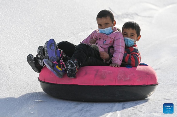 Children play on a snow tube at Oynak ski resort in Moyu County, northwest China's Xinjiang Uygur Autonomous Region, Jan. 9, 2022. Located on the southern brim of the Taklimakan Desert, Moyu County barely snows in winter. In order to boost its winter tourism and extend the tourism season, the county built Oynak ski resort by making artificial snow, fueling people's passion for winter sports here.