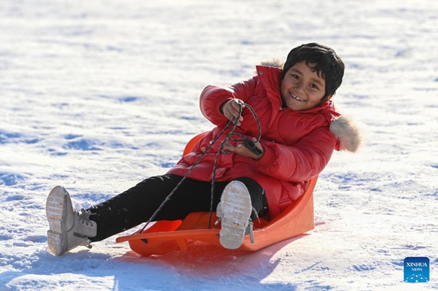 A child has fun at Oynak ski resort in Moyu County, northwest China's Xinjiang Uygur Autonomous Region, Jan. 9, 2022. Located on the southern brim of the Taklimakan Desert, Moyu County barely snows in winter. In order to boost its winter tourism and extend the tourism season, the county built Oynak ski resort by making artificial snow, fueling people's passion for winter sports here.