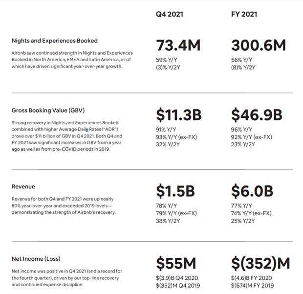 Airbnb said it’s “encouraged” by what it is seeing so far this year. “The impact of omicron has quickly dissipated and guests are confidently booking for the summer travel season early in the year,” the company said. Airbnb now expects the number of nights and experiences booked in the first quarter to “significantly exceed” the first-quarter levels of 2019.