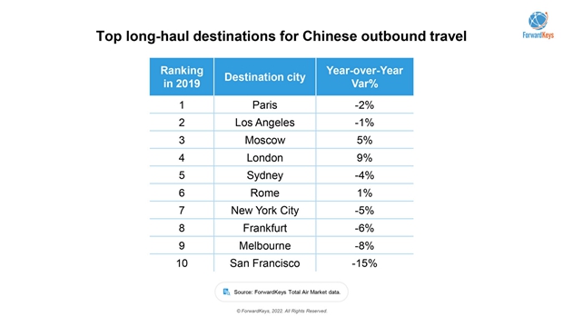 Popular destination cities in Europe, Australia and the USA included Paris, Los Angeles, Moscow, London, Sydney, Rome, New York, Frankfurt, Melbourne, and San Francisco, with London (+9%) and Moscow (+5%) showing the largest increases.