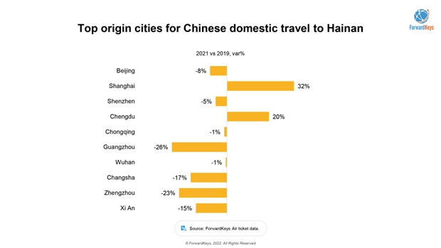 But it’s not only the gaming aspect that draws travellers away from home. Look at Hainan, where surfing and shopping have grown in popularity. Travellers to Hainan recovered 96% in 2021 versus 2019.