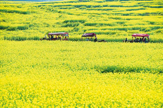 Tourists immerse themselves in the vibrancy of rapeseed flowers in Luoping, Yunnan province.[Photo/Xinhua]