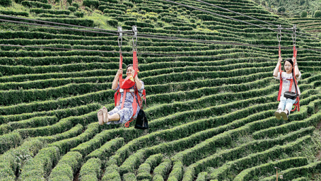 A rope slide allows tourists to enjoy a unique view of a tea plantation in Gulou village in Shaoyang, Hunan province. TENG ZHIZHONG/FOR CHINA DAILY