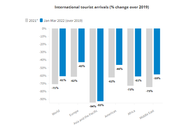 The Middle East (+132%) and Africa (+96%) also saw strong growth in Q1 2022 compared to 2021, but arrivals remained 59% and 61% below 2019 levels respectively. Asia and the Pacific recorded a 64% increase over 2021 but again, levels were 93% below 2019 numbers as several destinations remained closed to non-essential travel.