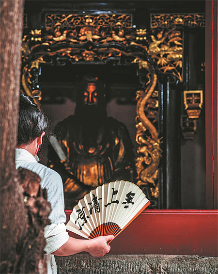 A monk fans himself in front of one of the temple's deity statues.[Photo provided by Michael Rhys Card/China Daily]