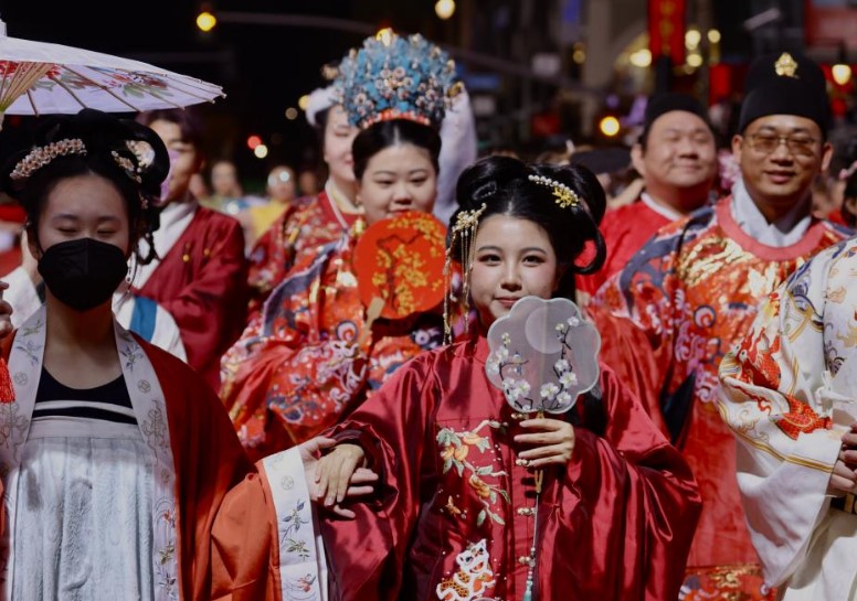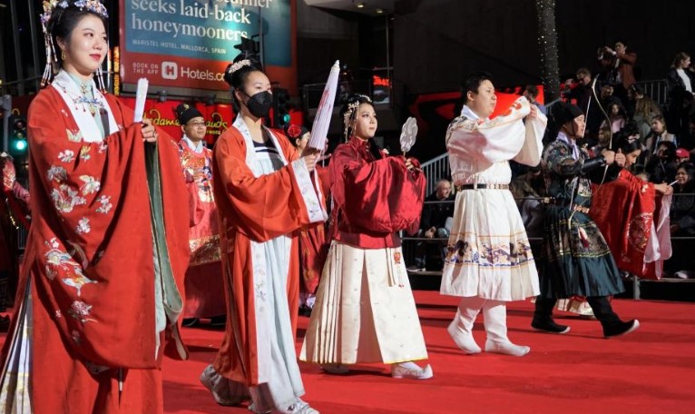 Performers in traditional Chinese attire attend the 90th Hollywood Christmas Parade in Los Angeles, the United States, Nov. 27, 2022. Los Angeles's Christmas season, in the western U.S. state of California, kicked off with a roar on Sunday as life-sized dinosaurs from the "Dinosaurs in the Valley" live show rampaged down Hollywood Blvd in the annual Hollywood Christmas Parade. It went all out, featuring giant balloons, floats, marching bands, vocal performers, international performers and the largest group of Chinese performers ever presented in its 90-year history. [Photo/Xinhua]