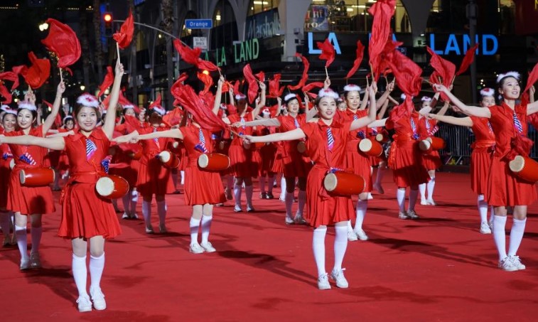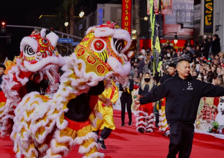 People from the local Chinese community perform during the 90th Hollywood Christmas Parade in Los Angeles, the United States, Nov. 27, 2022. Los Angeles's Christmas season, in the western U.S. state of California, kicked off with a roar on Sunday as life-sized dinosaurs from the "Dinosaurs in the Valley" live show rampaged down Hollywood Blvd in the annual Hollywood Christmas Parade. It went all out, featuring giant balloons, floats, marching bands, vocal performers, international performers and the largest group of Chinese performers ever presented in its 90-year history. [Photo by Zeng Hui/Xinhua]