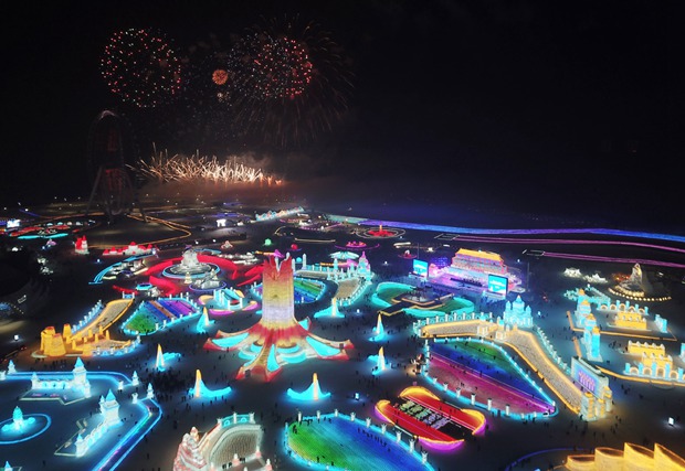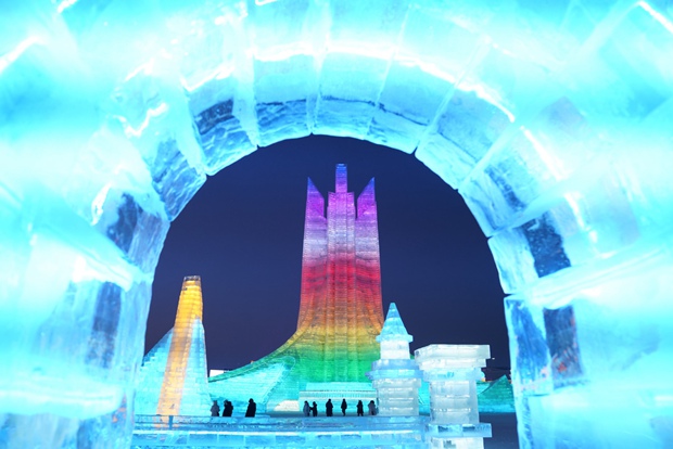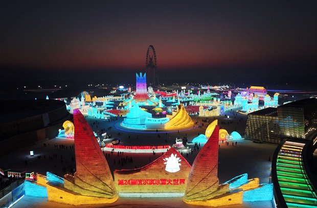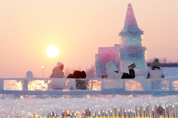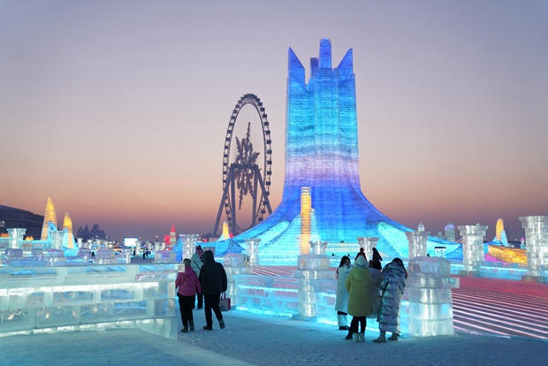 Visitors visit the Harbin Ice and Snow World in Harbin, Northeast China's Heilongjiang province, Jan 5, 2022. The 39th Harbin International Ice and Snow Festival was unveiled on Thursday at the Harbin Ice and Snow World, the largest ice theme park in China. A number of ice and snow activities will be launched during the festival to highlight the unique charm and vitality of the city's ice and snow culture. [Photo/Xinhua]
