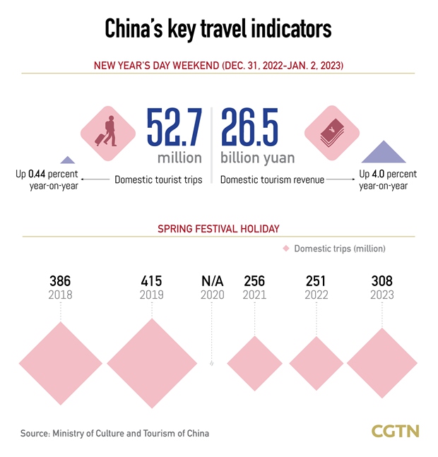 From December 31, 2022 to January 2, 2023, about 52.7 million domestic tourist trips were made, with the tourism revenue reaching 26.5 billion yuan ($3.8 billion), according to data released by the Ministry of Culture and Tourism on January 2.