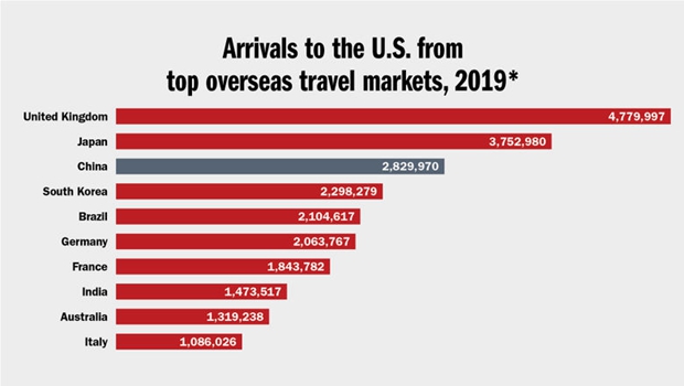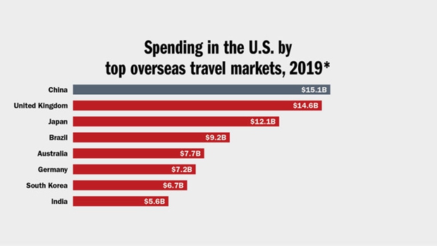 And for the U.S., the importance of the China market couldn't be overstated. Despite being the third-largest overseas market by arrivals in 2019, it rose to No. 1 in spending: about 2.9 million visitors from China spent $15 billion in the U.S., according to the U.S. Travel Association. For comparison, that year the U.S. recorded 4.7 million travelers and $14.6 billion from its largest overseas market by arrivals, the U.K.