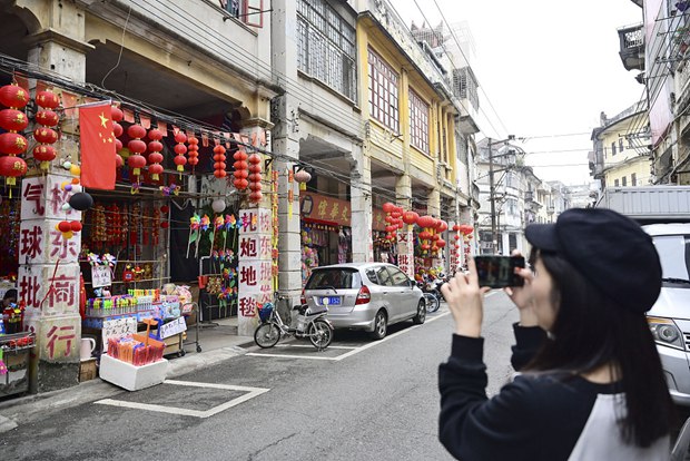 A visitor takes pictures of old shops in Qimingli, which appeared in the hit TV drama "The Knockout." /CFP