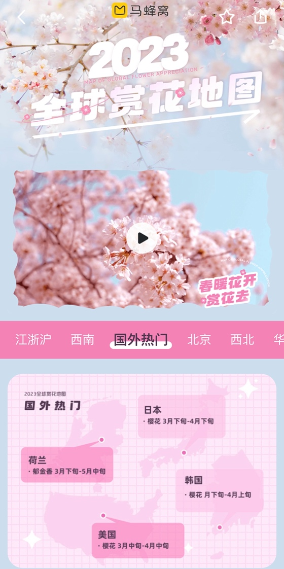 The outbound tourism environment continues to improve, and more and more young people turn their eyes to overseas destinations for flower appreciation. In Japan, which is approaching the cherry blossom season, the popularity has increased by more than 200% month-on-month in the past week. "Sakura chasing route" has become a popular search term about Japan recently. In order to meet young people's demand for overseas flower appreciation, the 2023 Flower Appreciation map will be expanded to cover the whole world, showing people by region and flower species. In addition to practical guideline information such as the best flowering season and tour route, you can also have an in-depth understanding of the destination's featured gameplay, the best camera position and other personalized experience through the high-quality notes below.
