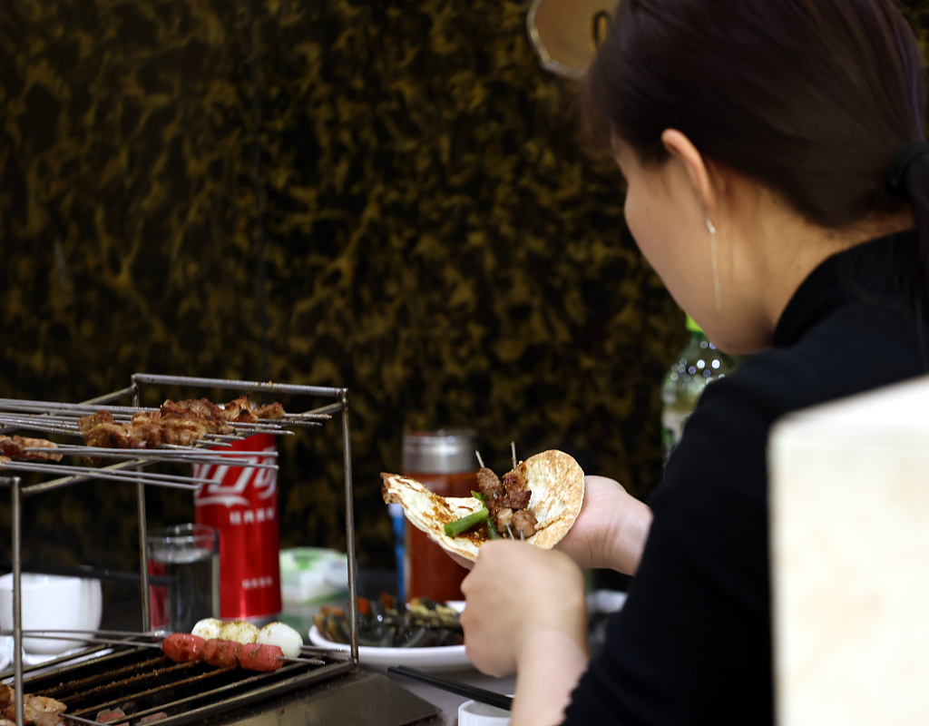 A diner rolls a pancake with two skewers and some scallions at a barbecue restaurant in Zibo. /CFP