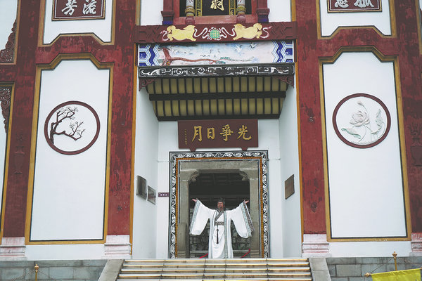 At the entrance of the traditional gate, with its exquisite decorations, an old man dressed in white attire, playing Qu Yuan, recites aloud the man's poetry, which echoes with rich Chinese philosophy.