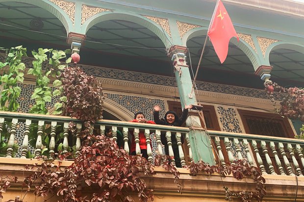 A photo shows two children on a balcony in Kashgar, Xinjiang. /CGTN