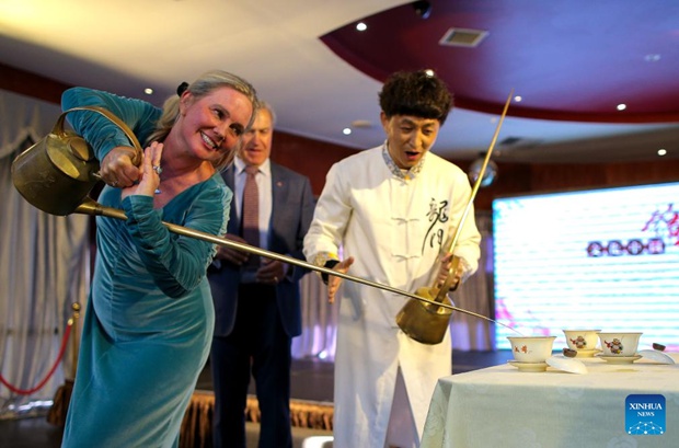 A participant tries the long-pot tea during the "Cultural China, Splendid Sichuan" event in Auckland, New Zealand, Nov. 29, 2023. Kiwis are amazed by unique cultural events and cuisine from southwest China's Sichuan Province during a tourism promotion event held here on Wednesday.(Photo by Zhao Gang/Xinhua)