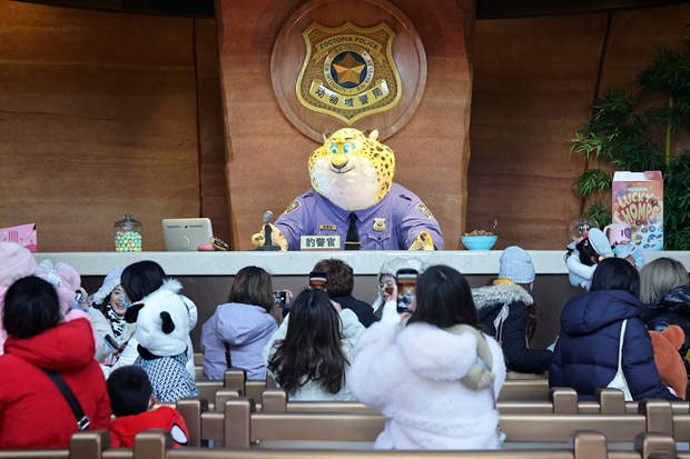Visitors interact with Benjamin Clawhauser, an obese cheetah officer in the animated film "Zootopia," at the Zootopia-themed park at the Shanghai Disney Resort on December 16, 2023. /IC