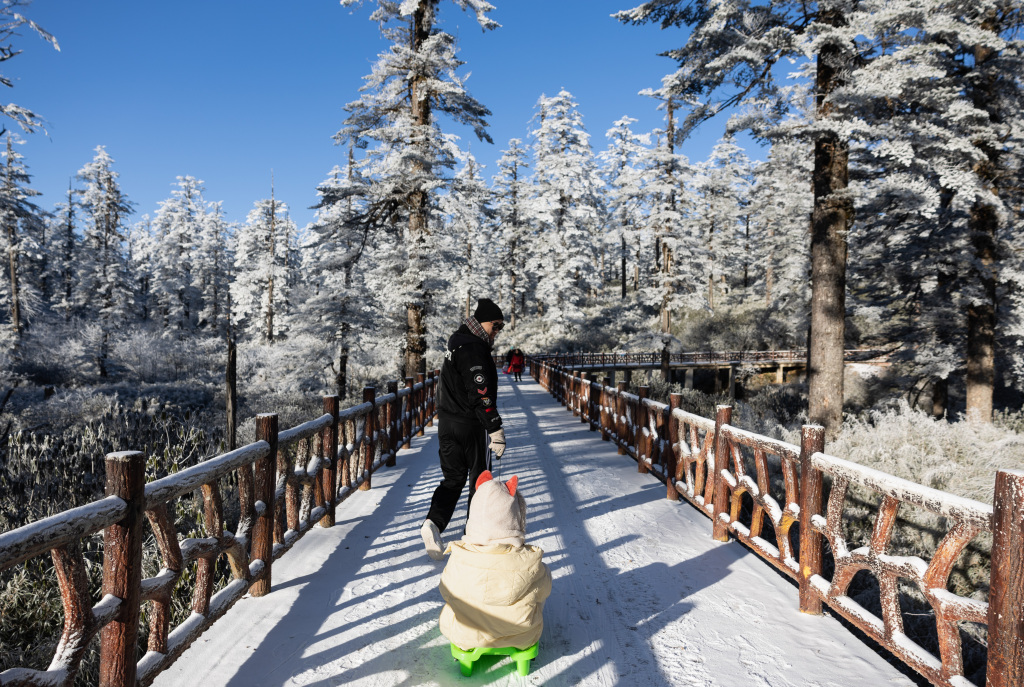 Visitors sledge along a snow-covered plank road at Wawushan National Forest Park in southwest China's Sichuan Province on December 24, 2023. /CFP