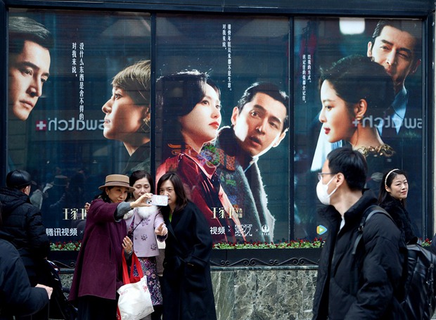 Visitors pose for photos in front of posters for the Chinese TV series "Blossoms Shanghai" at the Peace Hotel in Shanghai on January 13, 2024. The hit series has attracted many fans to visit the city's film locations. /CFP