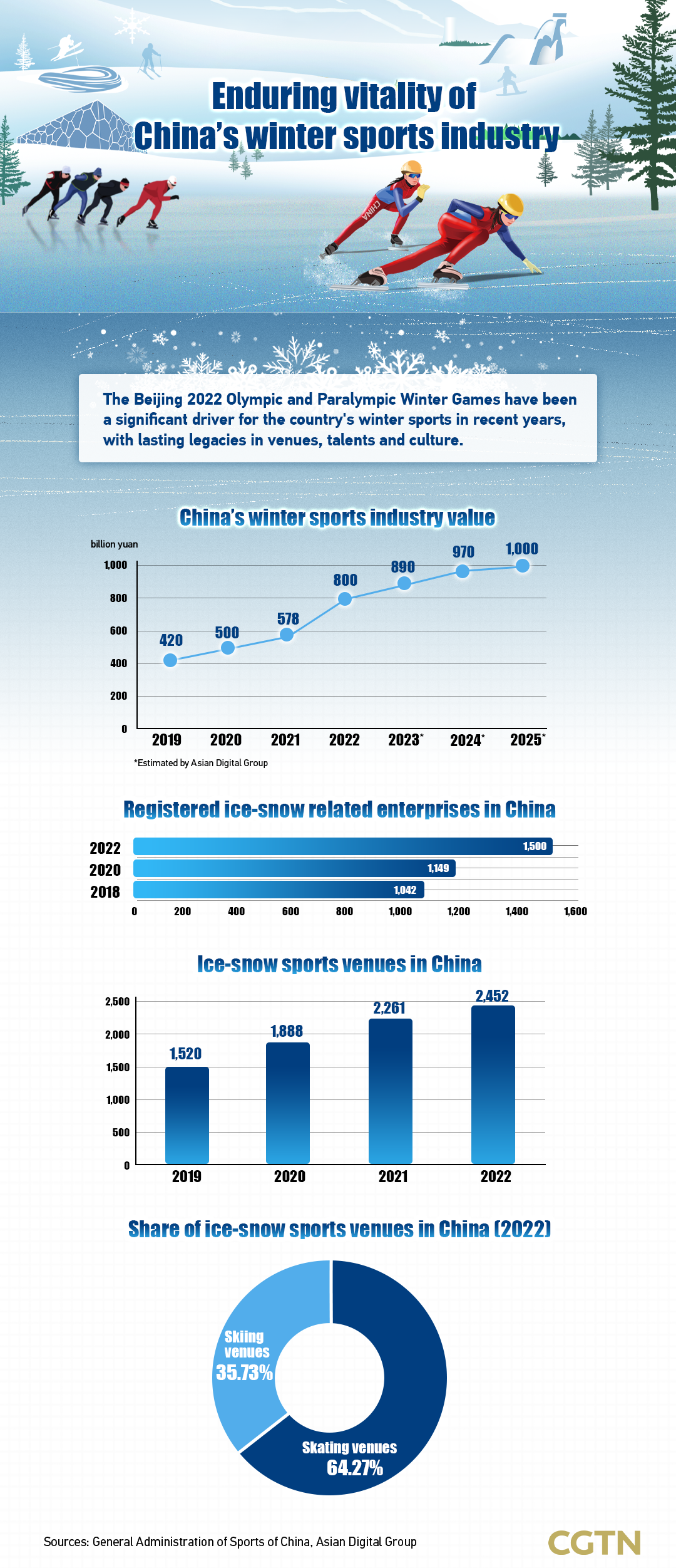 According to forecast by Asian Digital Group, China's winter sports industry is expected to be valued at one trillion yuan (about $140 billion) by 2025. The registered ice-snow related enterprises and venues in China reached over 1,500 and 2,452, respectively, data released by General Administration of Sports of China.