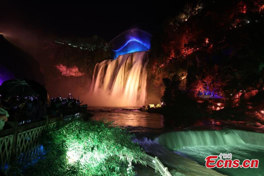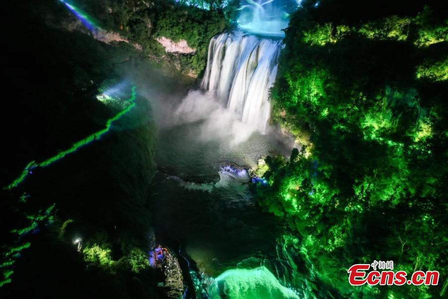A 3D light show illuminates the Huangguoshu Waterfall in Anshun City, southwest China's Guizhou Province, Aug. 6, 2024. (Photo: China News Service/Qu Honglun)