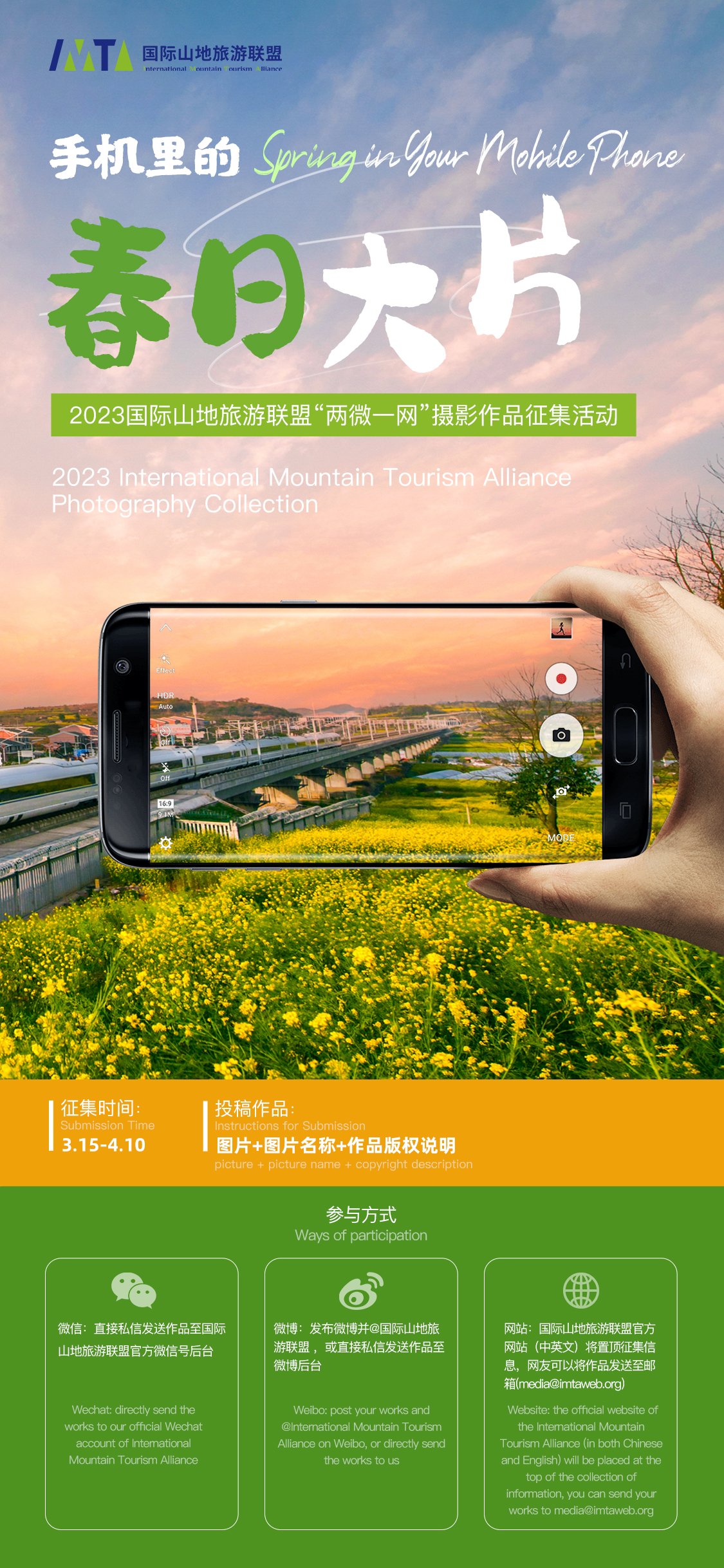 In order to fully tap the new highlights of spring mountain tourism and show the charm of spring mountain travel, the official Wechat Weibo and Website of International Mountain Tourism Alliance will take "Spring in Your Mobile Phone" as the theme to collect high-quality spring photography works for Internet users, tourism experts and photography lovers who love mountain tourism around the world.