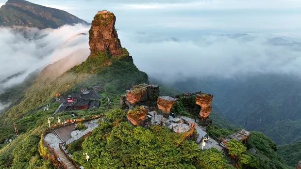 Fanjing Mountain, one of the top ten Buddhist mountains in China, is famous for its unique karst landform and rich biodiversity. The natural scenery of the mushroom stone, red cloud and golden top on the top of the mountain, as well as the ancient Buddhist temples, together form a fascinating picture scroll.