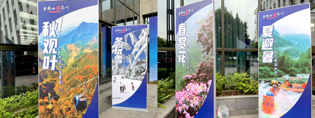 Promotional posters for Jinfo Mountain are seen outside the press conference room. (iChongqing/Truman PENG)